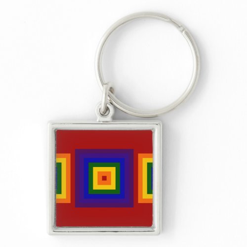 Show your love of color with alternating geometric rainbows. A series of red, orange, yellow, green, blue, indigo, and violet squares radiate out from the center of this festive design. On either side of the main square are halves of 2 rainbow squares with the colors sequenced in reverse order.